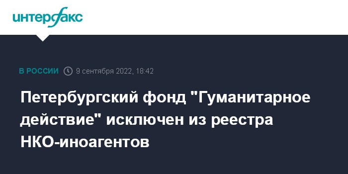 "В соответствии с распоряжением Минюста России из реестра некоммерческих организаций, выполняющих функции иностранного агента, исключен Санкт-Петербургский благотворительный фонд "Гуманитарное действие", - говорится в сообщении.