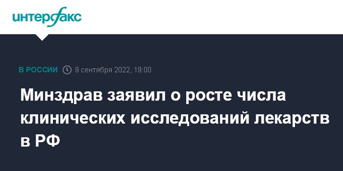 Москва. 9 сентября. INTERFAX.RU - Количество клинических исследований лекарственных препаратов, проведенных на территории России, увеличивается. Рост в том числе связан с возрастающей активностью отечественных фармацевтических производителей. Об этом сообщили в пресс-службе Минздрава РФ в пятницу.