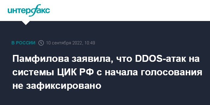 Москва. 10 сентября. INTERFAX.RU - Глава Центризбиркома РФ Элла Памфилова сообщила об отсутствии DDOS-атак на ресурсы ЦИК со старта голосования на выборах и отметила, что системы работают штатно.