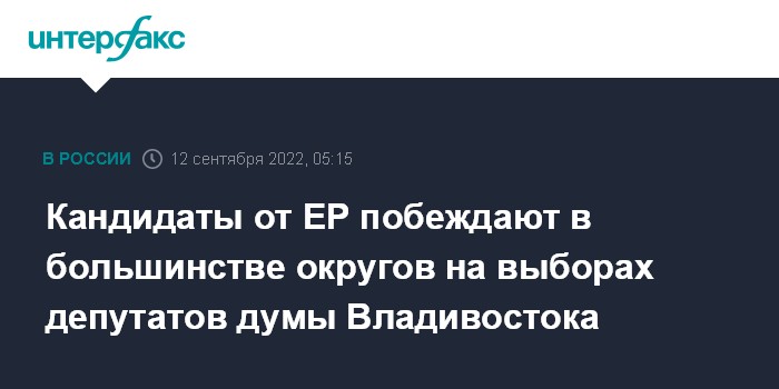 Москва. 12 сентября. INTERFAX.RU - Кандидаты от "Единой России", по предварительным данным, победили в 23 из 35 округов на выборах депутатов думы Владивостока по результатам обработки 100% протоколов, представители КПРФ лидируют в двух округах, следует из данных ЦИК РФ.