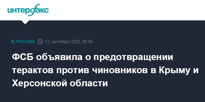 Москва. 12 сентября. INTERFAX.RU - Сотрудники ФСБ в ходе оперативной игры пресекли попытку Службы безопасности Украины провести теракты против должностных лиц военно-гражданской администрации Херсонской области и членов правительства Крыма. Об этом сообщил Центр общественных связей ФСБ.