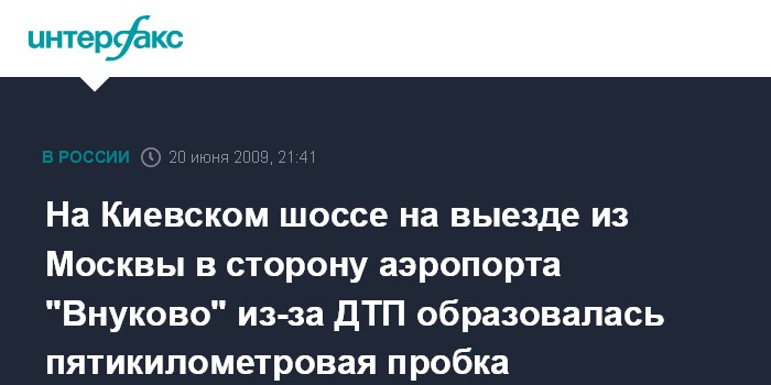 Москва. 20 июня. ИНТЕРФАКС - На Киевском шоссе в результате аварии образовалась огромная пробка, существует риск опоздания авиапассажиров, вылетающих из аэропорта "Внуково". Об этом сообщает находящийся на месте событий корреспондент "Интерфакса".