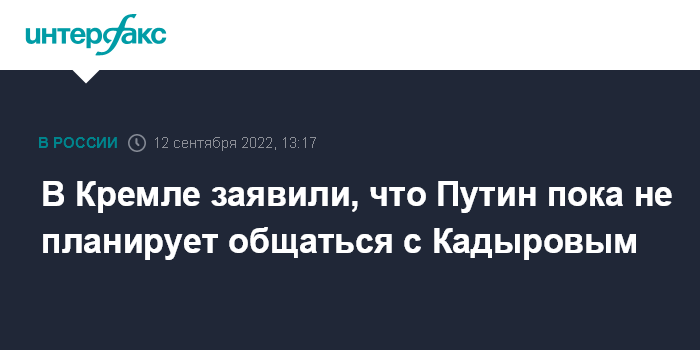 Москва. 12 сентября. INTERFAX.RU - Президент РФ Владимир Путин пока не планирует общаться с главой Чечни Рамзаном Кадыровым, который ранее выражал желание выйти на руководство страны, чтобы объяснить ситуацию на земле (на Украине - ИФ), заявил пресс-секретарь главы государства Дмитрий Песков.