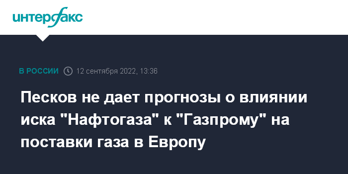 Москва. 12 сентября. INTERFAX.RU - В Кремле не берутся прогнозировать, как иск "Нафтогаза" к "Газпрому" может отразиться на поставках российского газа в Европу, заявил пресс-секретарь президента РФ Дмитрий Песков.