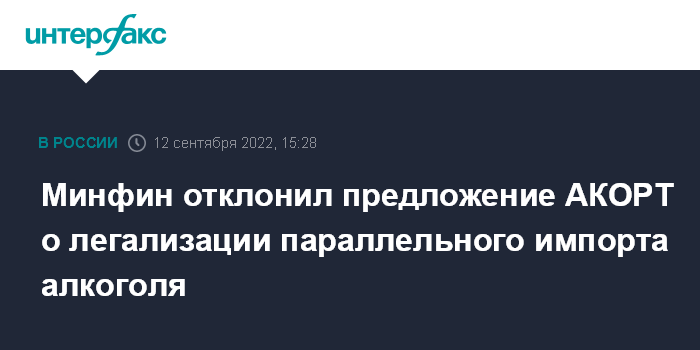 Москва. 12 сентября. INTERFAX.RU - Минфин России выступил против включения алкоголя в перечень товаров, параллельный импорт которых в РФ разрешен. Ранее с предложением разрешить параллельный импорт алкоголя выступила Ассоциация компаний розничной торговли (АКОРТ, объединяет крупнейших российских ритейлеров, включая X5 Retail Group, "Магнит", "Ленту" и др.).