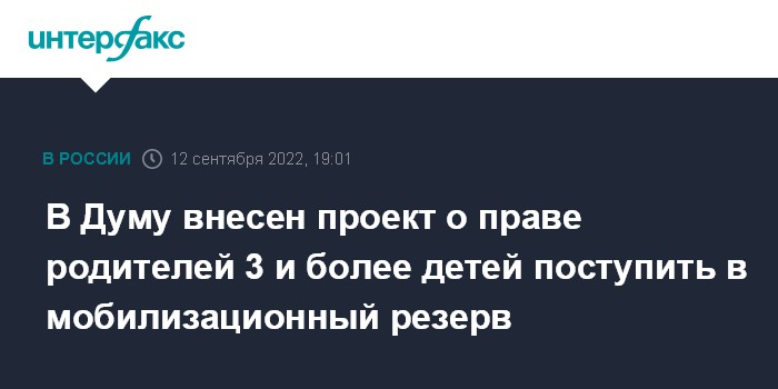 Москва. 12 сентября. INTERFAX.RU - Законопроект, предоставляющий родителям трех и более детей возможность поступить в мобилизационный резерв, внесен в Госдуму РФ. Это следует из базы данных нижней палаты парламента.