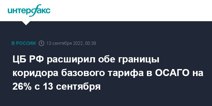 Москва. 13 сентября. INTERFAX.RU - Банк России расширил верхнюю и нижнюю границы коридора базового тарифа в ОСАГО на 26% в каждую сторону с 13 сентября.