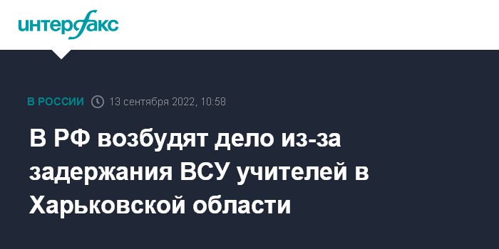 Москва. 13 сентября. INTERFAX.RU - Российские следователи разберутся в обстоятельствах задержания украинскими военными учителей в Харьковской области, преподававших в школах по российским программам обучения, сообщается во вторник в телеграм-канале Следственного комитета РФ (СКР).