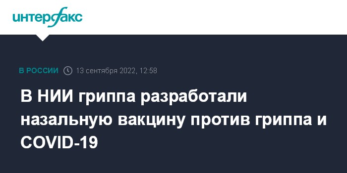 Москва. 13 сентября. INTERFAX.RU - Назальную вакцину, которая одновременно будет защищать от гриппа и коронавируса, разработали в Научно-исследовательском институте гриппа имени А.А.Смородинцева Минздрава России, в настоящее время проводятся клинические исследования препарата, сообщил директор НИИ Дмитрий Лиознов.