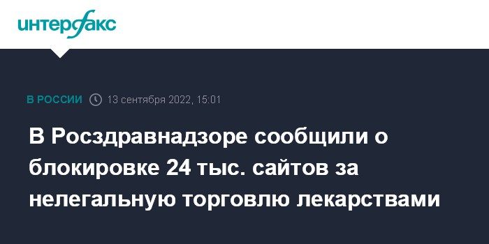 Москва. 13 сентября. INTERFAX.RU - В России заблокированы свыше 24 тыс. сайтов, которые нелегально занимались продажей лекарственных препаратов, сообщила руководитель Федеральной службы по надзору в сфере здравоохранения (Росздравнадзора) Алла Самойлова.