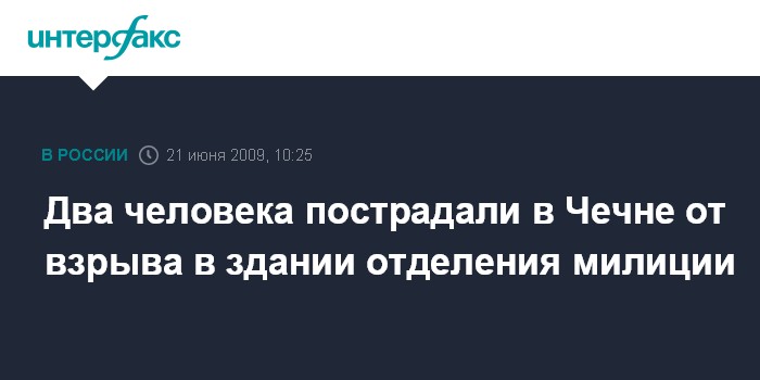 Москва. 21 июня. INTERFAX.RU - Два человека пострадали под Грозным в результате взрыва баллона с карбидом в здании отделения милиции.