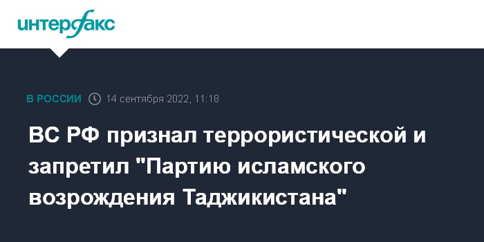 Москва. 14 сентября. INTERFAX.RU - Верховный суд России в среду признал террористической "Партию исламского возрождения Таджикистана" и запретил ее деятельность на территории страны, сообщили "Интерфаксу" в пресс-службе суда.