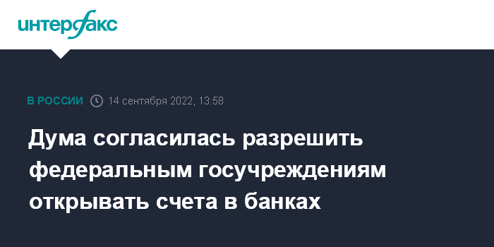 Москва. 14 сентября. INTERFAX.RU - Госдума приняла в первом чтении законопроект № 155690-8, по которому в 2022 году федеральные государственные учреждения смогут открывать счета в Банке России и кредитных организациях с разрешения Минфина.