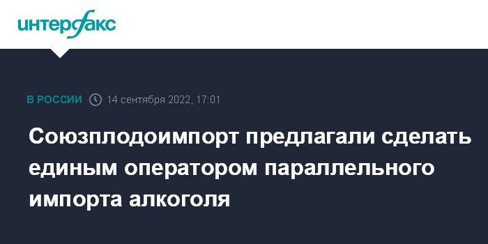 Москва. 14 сентября. INTERFAX.RU - Росалкогольрегулирование предлагало сделать ФКП "Союзплодоимпорт" единым оператором параллельного импорта алкоголя в РФ в случае, если такие поставки разрешат. Об этом сообщил "Интерфаксу" источник, знакомый с письмом Минфина в правительство.
