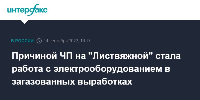 Москва. 14 сентября. INTERFAX.RU - Ростехнадзор завершил техническое расследование причин аварии на шахте "Листвяжная" в Кузбассе, где из-за ЧП в ноябре 2021 года погибли 52 человека; основной ее причиной стала работа людей с электрооборудованием в загазованных выработках, сообщила пресс-служба ведомства в среду.
