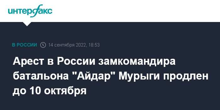 Москва. 14 сентября. INTERFAX.RU - В Ростове-на-Дону Ленинский районный суд продлил до 10 октября арест заместителю командира украинского батальона "Айдар" Денису Мурыге (внесен в перечень лиц и организаций, в отношении которых имеются сведения об их причастности к экстремистской деятельности или террору), сообщили "Интерфаксу" в объединенной пресс-службе судов Ростовской области.