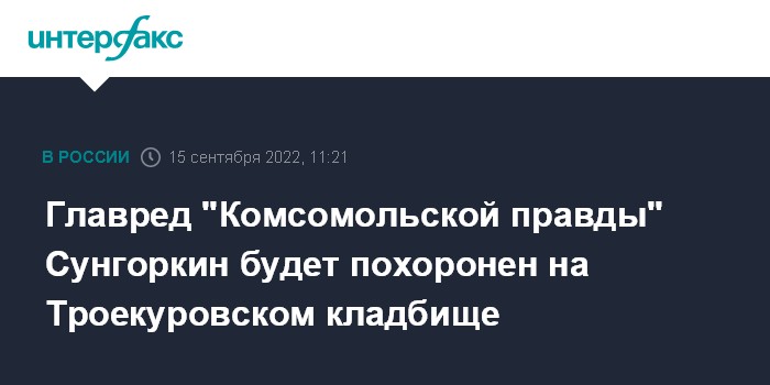 Москва. 15 сентября. INTERFAX.RU - Главного редактора "Комсомольской правды" Владимира Сунгоркина, о смерти которого стало известно накануне, похоронят на Троекуровском кладбище.