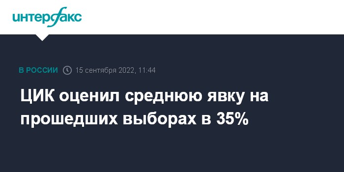 Москва. 15 сентября. INTERFAX.RU - На прошедших сентябрьских выборах в России средняя явка составила 35%, сообщила на заседании Центризбиркома председатель комисии Элла Памфилова.
