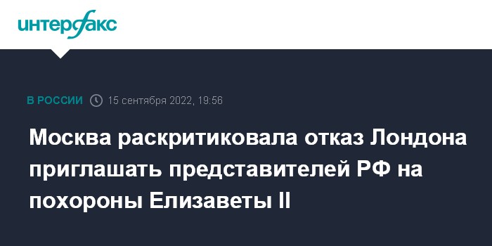 "МИД Великобритании проинформировал посольство России в Лондоне о решении воздержаться от направления российской стороне, в т.ч. руководству роспосольства, приглашений на траурные мероприятия в связи с кончиной Королевы Елизаветы II. В качестве предлога для такого шага англичане назвали продолжающуюся специальную военную операцию России на Украине", - говорится в комментарии представителя МИД РФ.