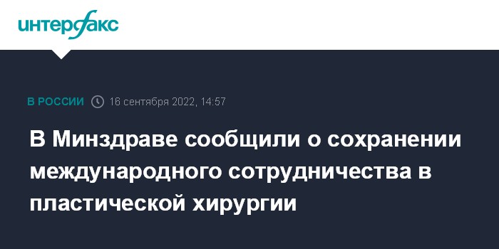 Москва. 16 сентября. INTERFAX.RU - В России нет проблем во взаимодействии с зарубежными партнерами в области пластической хирургии из-за геополитической обстановки; сотрудничество с ними продолжается, сообщила главный внештатный специалист - пластический хирург Минздрава России и столичного департамента здравоохранения Наталья Мантурова.
