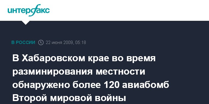 Хабаровск. 22 июня. ИНТЕРФАКС-ДАЛЬНИЙ ВОСТОК - В районе села Софийск Хабаровского края саперы и взрывотехники в ходе разминирования местности обнаружили 123 авиабомбы времен Второй мировой войны, 52 из которых уже уничтожено.
