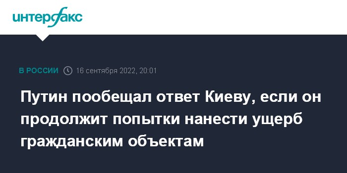 Москва. 16 сентября. INTERFAX.RU - Президент Владимир Путин заявил, что Россия сдержанно отвечает на попытки Украины нанести ущерб гражданской инфраструктуре РФ, но если они продолжатся, реакция будет более серьезной.