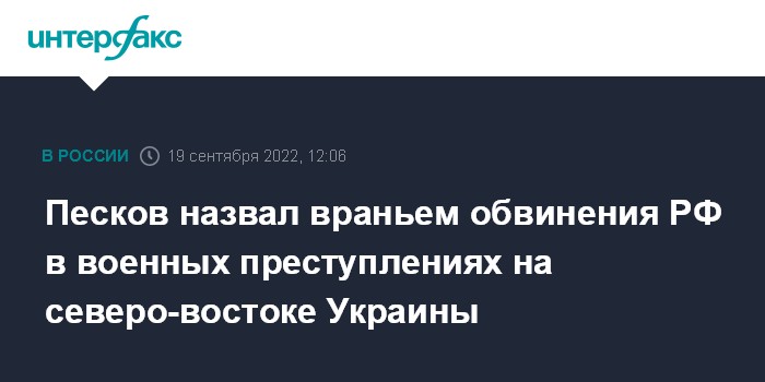 Москва. 19 сентября. INTERFAX.RU - Пресс-секретарь президента Дмитрий Песков назвал враньем обвинения Киева в адрес Россиив военных преступлениях на территориях, недавно перешедших под контроль Украины.