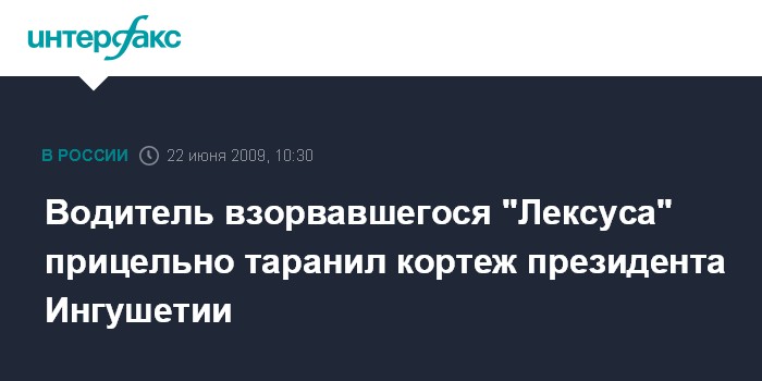Москва. 22 июня. INTERFAX.RU - Источник в правоохранительных органах Ингушетии сообщил, что легковой автомобиль, предположительно "Лексус", медленно двигался по трассе в ходе следования кортежа президента Ингушетии. После того, как машина ГАИ, следовавшая впереди кортежа, стала прижимать следовавший автомобиль, препятствуя его движению, водитель сделал резкий маневр, оказался почти в центре кортежа и тут же прогремел взрыв. От автомашины и того, кто в ней находился, практически ничего не осталось.