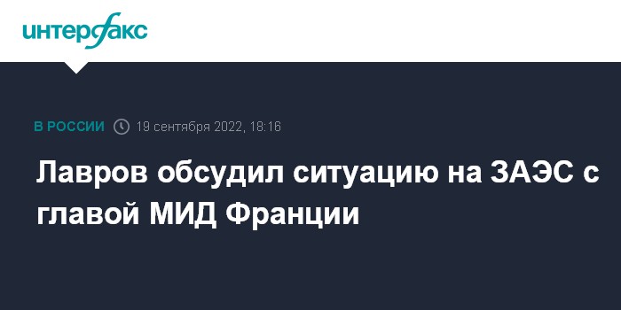 Москва. 19 сентября. INTERFAX.RU - Глава МИД РФ Сергей Лавров провел телефонный разговор с французской коллегой Катрин Колонной, министры обсудили ситуацию на Украине с акцентом на обеспечение безопасности Запорожской АЭС, сообщили в МИД России.