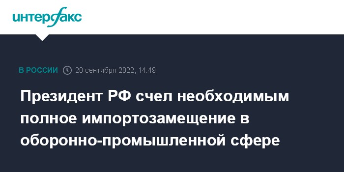 Москва. 20 сентября. INTERFAX.RU - Импортозамещение в оборонно-промышленном комплексе должно быть реализовано на 100%, заявил президент РФ Владимир Путин.