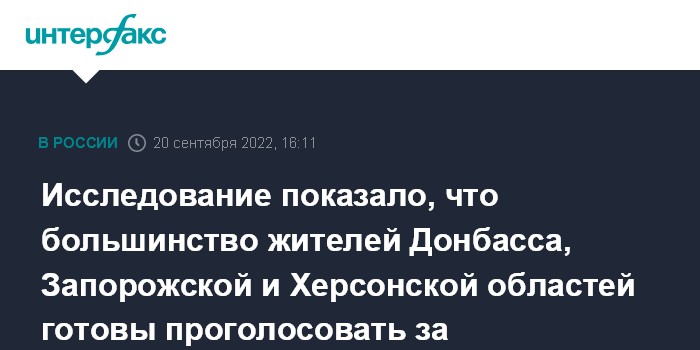 Москва. 20 сентября. INTERFAX.RU - Подавляющее большинство жителей Донецкой и Луганской народных республик, Запорожской и Херсонской областей поддерживают проведение Референдума о вхождении своего региона в состав России и готовы принять участие в голосовании, свидетельствуют данные исследования, проведенного Крымским Республиканским институтом политических и социологических исследований (РИПСИ).