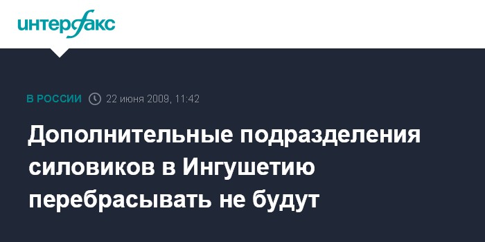 Москва. 22 июня. INTERFAX.RU - Дополнительные подразделения силовых структур в Ингушетию, где в понедельник произошло покушение на главу республики Юнус-Бека Евкурова, перебрасывать не планируется, заявил "Интерфаксу" высокопоставленный представитель МВД РФ.