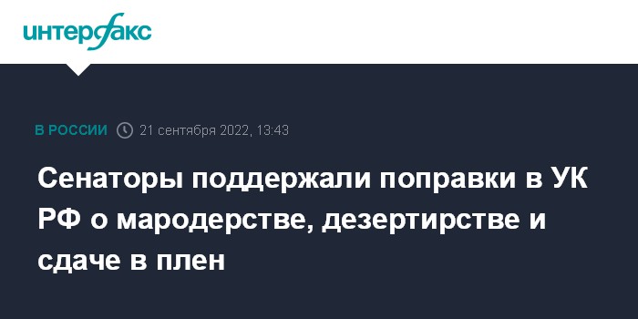 Москва. 21 сентября. INTERFAX.RU - Совет Федерации на заседании в среду одобрил закон с поправками в Уголовный кодекс РФ о наказании за дезертирство, мародерство и сдачу в плен.