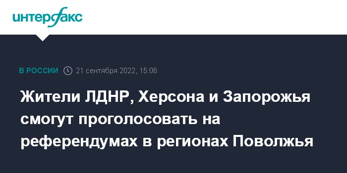Москва. 21 сентября. INTERFAX.RU - Избирательные комиссии в регионах Поволжья организуют участки для проведения референдумов о вхождении Донецкой и Луганской народных республик, а также Запорожской и Херсонской областей в состав России.