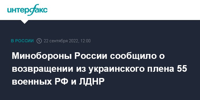 Москва. 22 сентября. INTERFAX.RU - Минобороны России сообщило о возвращении на родину 55 пленных военнослужащих армии РФ, Донецкой и Луганской народных республик.