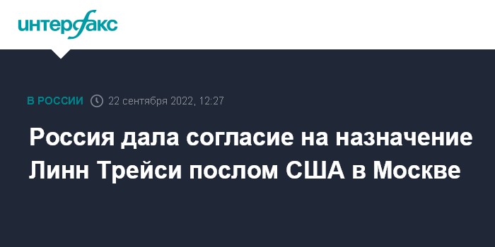 Москва. 22 сентября. INTERFAX.RU - Россия дала агреман (предварительное согласие) на назначение Линн Трейси послом США в Москве, сообщил замглавы МИД РФ Сергей Рябков.