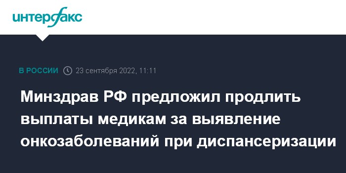 Москва. 23 сентября. INTERFAX.RU - Минздрав России предлагает продлить до 2025 года осуществление денежных выплат медицинским работникам за выявление онкологических заболеваний в ходе проведения диспансеризации и профилактических медицинских осмотров населения.