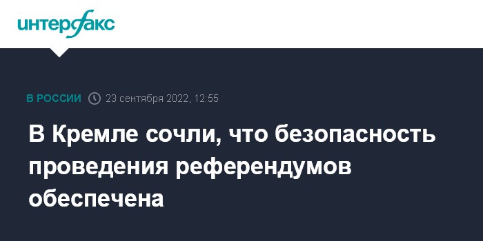 Москва. 23 сентября. INTERFAX.RU - Безопасность надлежащего проведения референдумов в ДНР, ЛНР, Запорожской и Херсонской областях обеспечена, заявил пресс-секретарь президента РФ Дмитрий Песков.