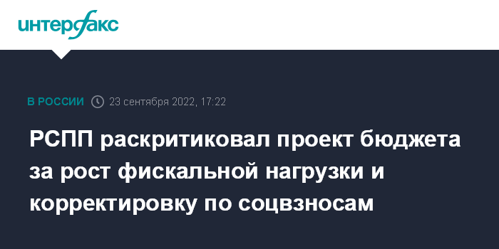 Москва. 23 сентября. INTERFAX.RU - Российский союз промышленников и предпринимателей (РСПП) призывает вернуться к дискуссии о фискальной нагрузке на бизнес в контексте обсуждения бюджета на 2023-2025 гг, проект которого был накануне одобрен правительством РФ, а также высказывает опасения по поводу ожидаемого роста расходов по социальным страховым взносам.