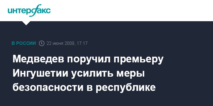 Москва. 22 июня. INTERFAX.RU - Президент РФ Дмитрий Медведев провел телефонный разговор с председателем правительства Республики Ингушетия Рашидом Гайсановым, сообщила в понедельник журналистам пресс-секретарь президента Наталья Тимакова. По ее словам, в ходе разговора обсуждалась ситуация в республике. Дмитрий Медведев поручил премьер-министру Ингушетии усилить меры безопасности в республике и обеспечить бесперебойную деятельность всех органов власти Ингушетии.