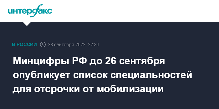 "Минцифры готовит рекомендуемый перечень специальностей по каждому отраслевому направлению. Список будет опубликован не позднее 26 сентября. Минцифры прорабатывает с Минобороны форму подачи списков сотрудников, подходящих под критерии отсрочки от частичной мобилизации. Форма будет открыта на следующей неделе на Госуслугах", - говорится в сообщении.