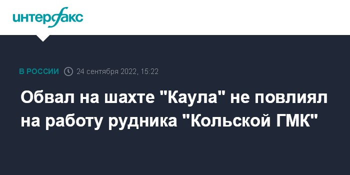 Москва. 24 сентября. INTERFAX.RU - Обвал горной массы на шахте "Каула" АО "Кольская ГМК" (КГМК, "дочка" ГМК "Норникель"), который произошел в субботу и привел к смерти горнорабочего, не повлиял на работу рудника, сообщила пресс-служба КГМК.