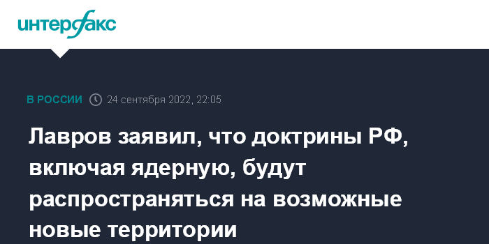 Москва. 24 сентября. INTERFAX.RU - Все российские законы и доктрины, включая ядерную, будут распространяться и на новые территории в случае их закрепления в Конституции страны, заявил глава МИД РФ Сергей Лавров.