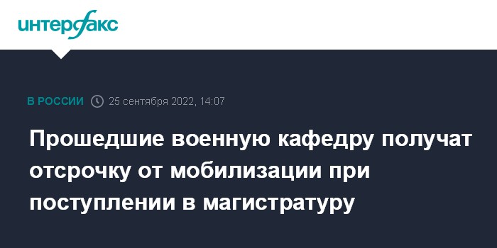 Москва. 25 сентября. INTERFAX.RU - Студенты вузов, прошедшие военную кафедру при обучении на бакалавриате, при поступлении в магистратуру сохраняют отсрочку от частичной мобилизации. При поступлении на специалитет права отсрочки они лишаются, сообщается в официальном телеграм-канале "Объясняем.рф".