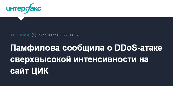 Москва. 26 сентября. INTERFAX.RU - На фоне проведения референдумов в Донецкой и Луганской народных республиках, Запорожской и Херсонской областях на сайт Центризбиркома России была осуществлена DDoS-атака сверхвысокой интенсивности, сообщила глава ЦИК РФ Элла Памфилова.
