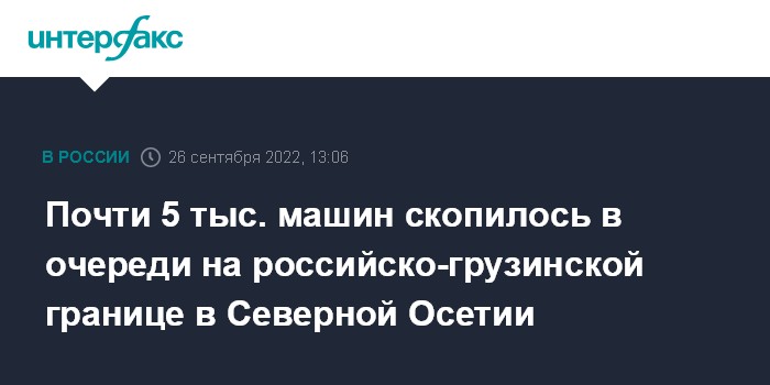 Москва. 26 сентября. INTERFAX.RU - Около 3,5 тысячи легковых и 1,3 тысячи грузовых автомобилей скопилось в очереди на российско-грузинской границе в Северной Осетии, сообщил в понедельник вице-премьер республики Ирбек Томаев.