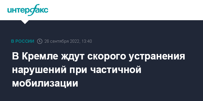 Москва. 26 сентября. INTERFAX.RU - В Кремле надеются, что нарушения при реализации указа президента о частичной мобилизации будут устраняться повышенными темпами, заявил на брифинге пресс-секретарь президента Дмитрий Песков.