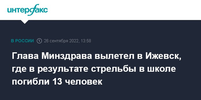 Москва. 26 сентября. INTERFAX.RU - Глава Минздрава России Михаил Мурашко вылетел в Ижевск, где в понедельник утром произошла стрельба в школе, сообщил помощник министра Алексей Кузнецов.