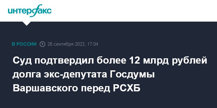 Суд подтвердил более 12 млрд рублей долга экс-депутата Госдумы Варшавского перед РСХБ