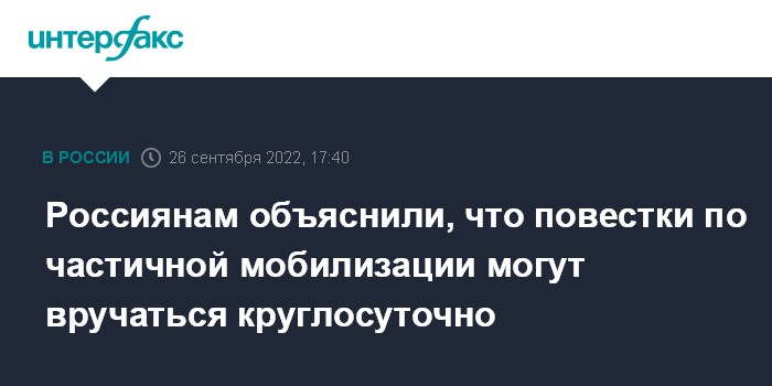 Москва. 26 сентября. INTERFAX.RU - Повестки о призыве к частичной мобилизации в России могут вручаться круглосуточно, сообщается в официальном телеграм-канале портала "Объясняем.рф".